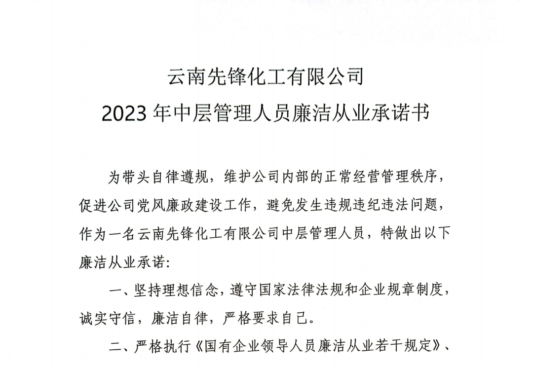 春節(jié)將至,為切實把好廉政關(guān),及時打好節(jié)前“預(yù)防針”,提高黨員領(lǐng)導(dǎo)干部“免疫力”。先鋒化工開展以“廉”為核心,“潔”為輔助的廉潔“五個一”活動,即簽訂一份廉潔承諾書、懸掛一條廉潔橫幅、進(jìn)行一次廉潔談話、發(fā)送一份廉潔過節(jié)提醒函、開展一次警示教育,通過多渠道多角度開辟新途徑,引導(dǎo)黨員干部群眾樹立正確的人生觀、價值觀,營造“敬廉崇潔”的良好企業(yè)環(huán)境。